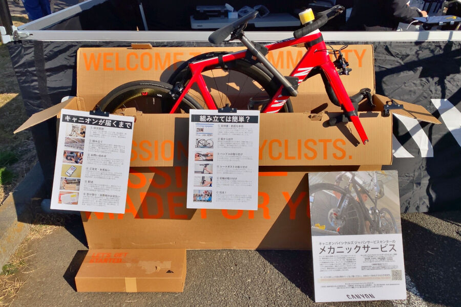 キャニオンはオンライン販売になりますので、「こんな形で自宅に届きますよ」のディスプレイが置かれていました。