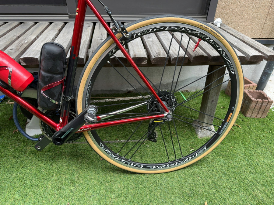 ライドから帰ってくると、縁側に自転車を立てかけて、タイヤを雑巾で拭き上げてから家の中に持ち込むようにしています。