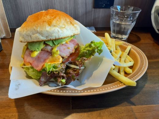 注文したのはまずは定番ということでオリジナルバーガー(1,300円)なのですが、アボガド、ベーコン、チーズと色々入ってまして、ここ最近の物価高騰を考えるとこういった手作りバーガーの中ではなかなかリーズナブル。(いやまあ、安くはないですが、最近は平気で2,000円近くの値札つけたりしますからね・・・)