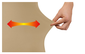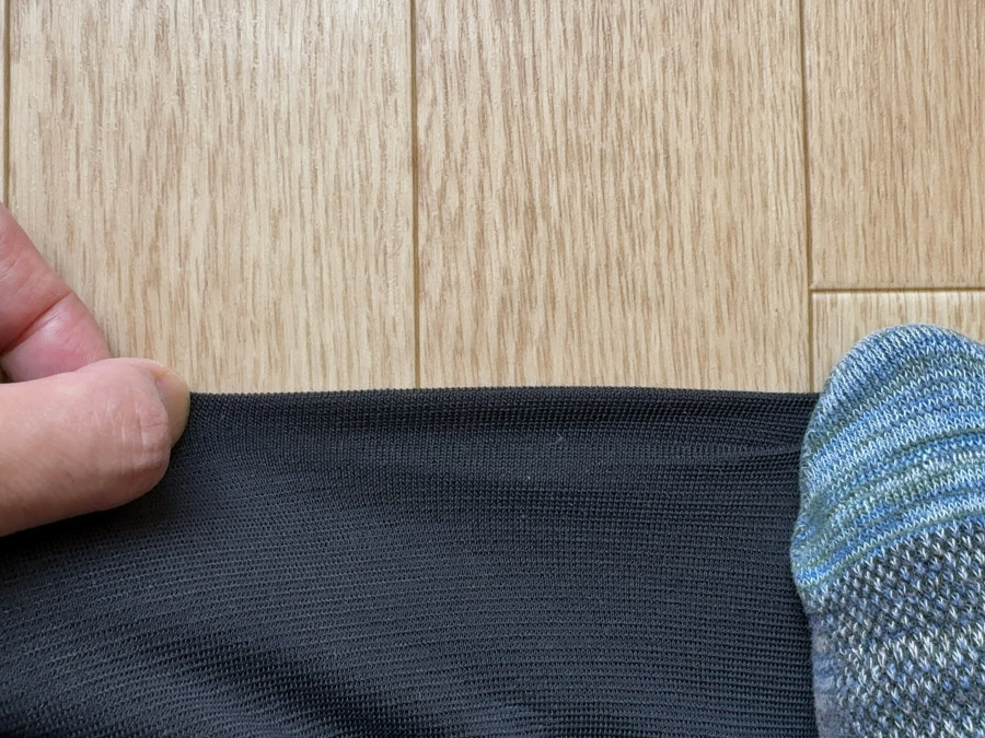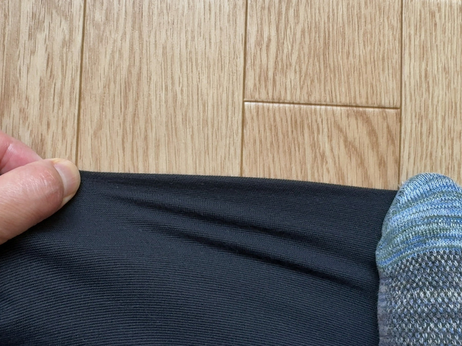 こんな感じで、右足で生地を押さえつけながら、無理のない範囲でどの程度までストレッチするかを調べてみます。